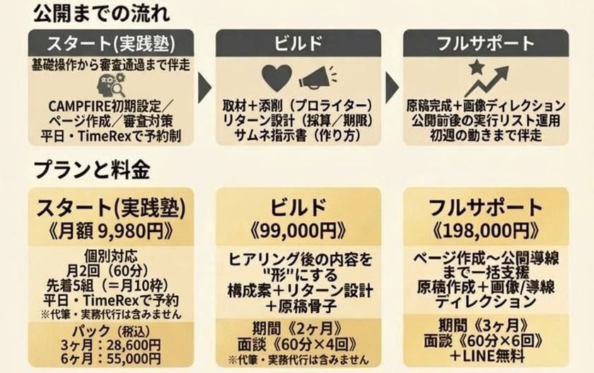 クラウドファンディングサイト「CAMPFIRE」の公式クリエイティブパートナーと提携してクラウドファンディングの支援を行っています。