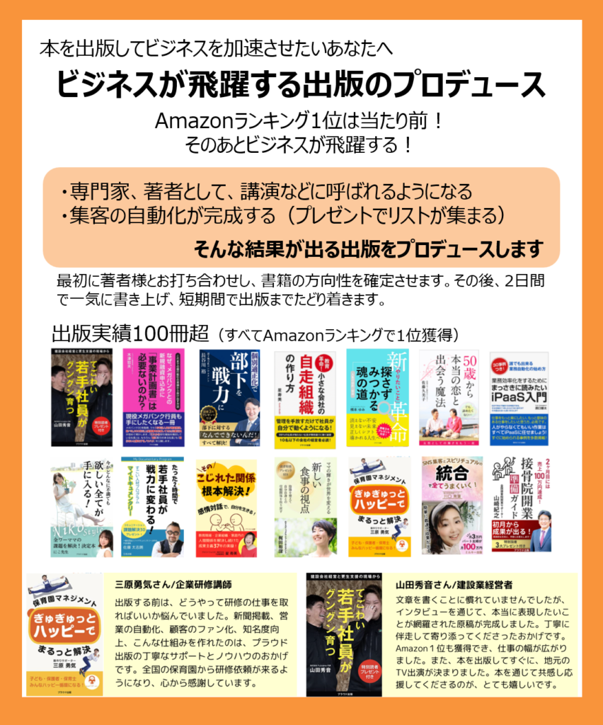 「出版した瞬間から確度の高い顧客リストを集められる」ことが武器の出版社と提携して出版プロデュースのサービスを提供しています。当社は主に編集として関わっています。